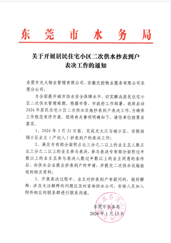 <td bindtype="0" valign="top" style="border-width:0" datasource="投票内容" rowspan="18" values="null" colspan="7" height="161pt"><font style="font-size:12pt;"><p style="text-align: left; font-family: 宋体; font-size: 16px; line-height: 1.75em;"><strong style="line-height: 1.75em;">一、投票范围</strong><br></p><p style="white-space: normal; font-family: 宋体; font-size: 16px; line-height: 1.75em; text-indent: 2em;">安联尚璟花园10栋、11栋、12栋、13栋、14栋、15栋、16栋、17栋、18栋、19栋、1栋、20栋、21栋、22栋、23栋、24栋、2栋、3栋、4栋、5栋、6栋、7栋、8栋、9栋</p><p style="white-space: normal; font-family: 宋体; font-size: 16px; line-height: 1.75em; text-indent: 2em;">总人数(专有部分人数之和):1126</p><p style="white-space: normal; font-family: 宋体; font-size: 16px; line-height: 1.75em; text-indent: 2em;">建筑物总面积(专有部分面积之和):120562.17㎡</p><p style="white-space: normal; font-family: 宋体;font-size: 16px; line-height: 1.75em;"><strong>二、投票起止时间</strong></p><p style="white-space: normal; font-family: 宋体; font-size: 16px; line-height: 1.75em; text-indent: 2em;">投票表决时间:从2026年03月20日 08时00分到2026年03月31日 18时00分止</p><p style="white-space: normal; font-family: 宋体; font-size: 16px; line-height: 1.75em; text-indent: 2em;"><br></p><p style="white-space: normal; font-family: 宋体;font-size: 16px; line-height: 1.75em;"><strong>三、投票详细描述</strong></p><p style="white-space: normal; font-family: 宋体; font-size: 16px; line-height: 1.75em; text-indent: 2em;"></p><p>根据东莞市水务局通知要求,开展居民住宅小区二次供水抄表到户业主表决工作,表决通过后将小区二次供水设施无偿移交供水属地水务局进行专业运作维护,由供水属地水务局直接抄表、收费、服务到户,规范居民用水供水水质与供水服务。</p><p></p><p style="white-space: normal; font-family: 宋体;font-size: 16px; line-height: 1.75em;"><strong>四、计票规则</strong></p><p style="white-space: normal; font-family: 宋体; font-size: 16px; line-height: 1.75em; text-indent: 2em;"><span style="font-family: 宋体; text-indent: 32px;">表决事项:开展居民住宅小区二次供水抄表到户的表决<br></span></p><p style="text-align: left; font-family: 宋体; font-size: 16px; line-height: 1.75em; text-indent: 2em;">计票规则:表决事项应当采用逐项记名投票逐项计票的方式表决,业主投票表决应当明示 赞同、反对或者弃权的表决意见。未投票表决的业主投票权数不得计入已参与表决票。</p><p></p><p style="white-space: normal; font-family: 宋体;font-size: 16px; line-height: 1.75em;"><strong>五、通过规则</strong></p><p style="white-space: normal; font-family: 宋体; font-size: 16px; line-height: 1.75em; text-indent: 2em;"><span style="font-family: 宋体; text-indent: 32px;">表决事项:开展居民住宅小区二次供水抄表到户的表决<br></span></p><p style="text-align: left; font-family: 宋体; font-size: 16px; line-height: 1.75em; text-indent: 2em;">通过规则:专有部分面积占比三分之二以上的业主且人数占比三分之二以上的业主参与表决。参与表决专有部分面积过半数的业主且参与表决人数过半数的业主同意</p><span style="font-family: 宋体; text-indent: 32px;"></span><p></p><p style="text-align: left; font-family: 宋体; font-size: 16px; line-height: 1.75em;"><strong>六、投票方式</strong></p><p style="text-align: left; font-family: 宋体; font-size: 16px; line-height: 1.75em; text-indent: 2em;"><span style="font-size: 16px; font-family: 宋体">在投票事项通知日起,请业主扫描二维码或者关注微信公众号(<strong><strong style="font-family: 宋体; text-indent: 32px; text-wrap: wrap;">东莞市住房和城乡建设局</strong></strong>)查看详细情况并进行投票。</span></p><p style="text-align: right; font-family: 宋体; font-size: 16px; line-height: 1.75em; text-indent: 2em;"><br></p><p style="text-align: right; font-family: 宋体; font-size: 16px; line-height: 1.75em;"> </p><p style="text-align: right; font-family: 宋体; font-size: 16px; line-height: 1.75em;"><br></p><p style="text-align: right; font-family: 宋体; font-size: 16px; line-height: 1.75em;"><br></p></font></td>
