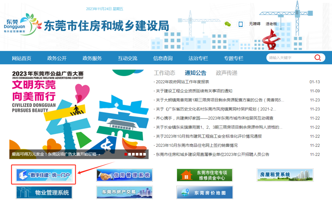 申购人可在2023年12月1日起登录网址:东莞市住房和城乡建设局http://zjj.dg.gov.cn/,点击“数字住建”统一门户图标进入,如下图: