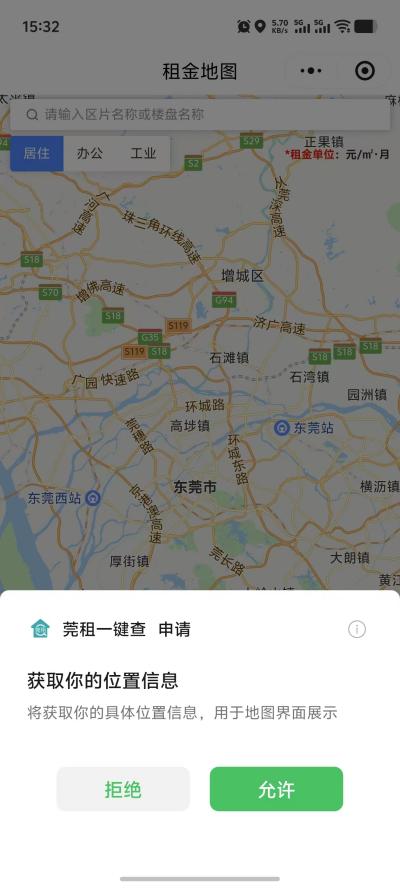 打开微信扫一扫扫描二维码或微信搜索“莞租一键查”小程序,点击进入小程序。页面下方有“获取你的位置信息”授权申请,用户可点击允许即可直接定位所在位置。