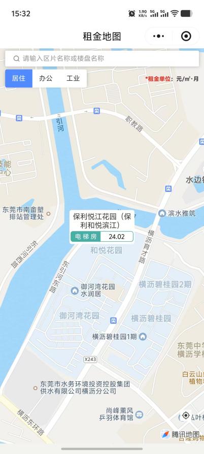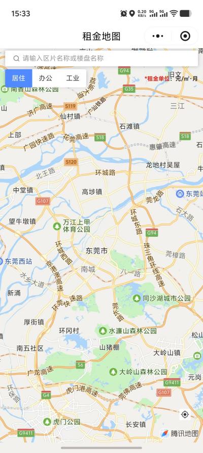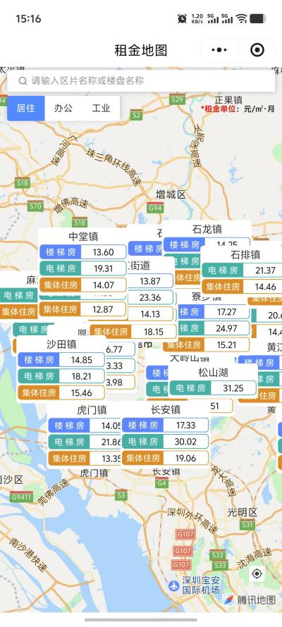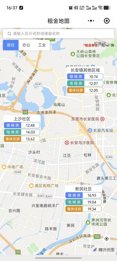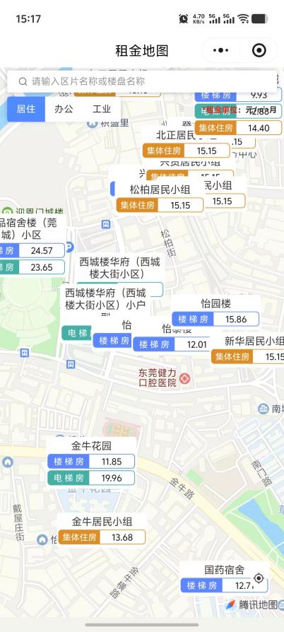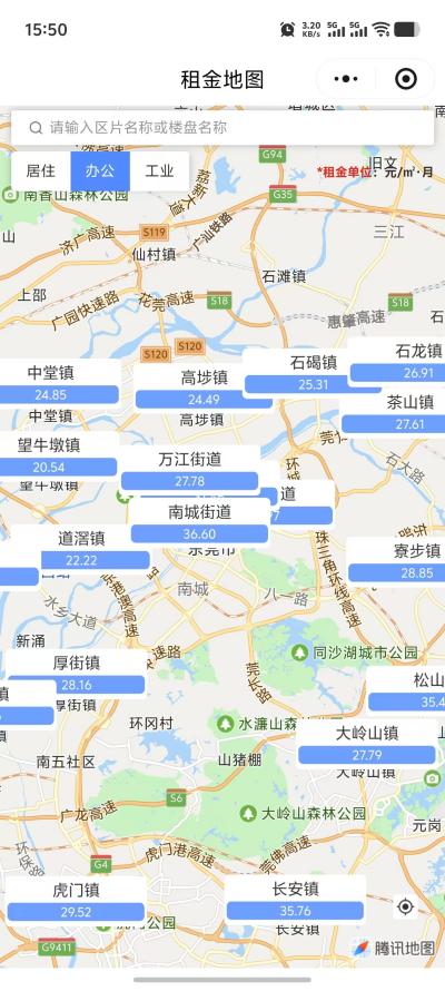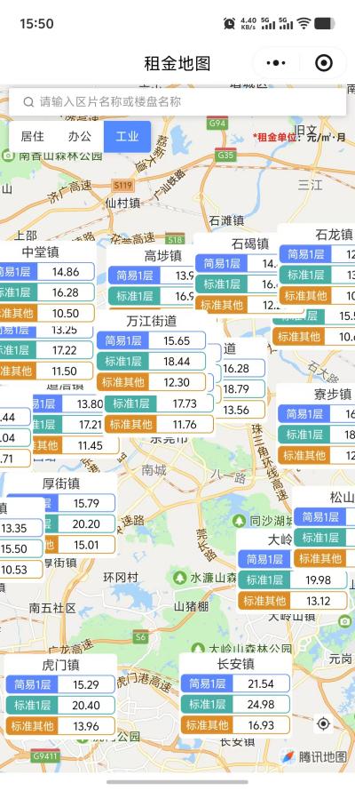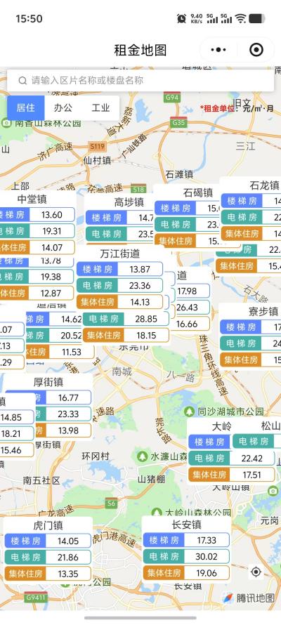 “莞租一键查”是东莞市住房和城乡建设局为向全市提供本市房屋租金参考价所推出的微信小程序,支持居住、办公、工业类房屋租金查询,通过地图层级放大或输入关键词搜索,就能查看东莞镇街、社区、楼盘等三级区片的租金信息(单位:元/㎡・月)。