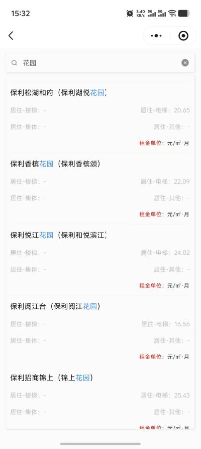 以居住用房租金搜索页面为例,点击小程序界面最上方的搜索框,输入需要查询对象的关键字进行模糊查询,在下拉结果选项中选择一项进行点击,界面将直接跳转至所查询对象的所在位置,并显示相应的租金;或输入全称进行精准查询,界面将直接跳转至所查询对象的所在位置,并显示相应的租金。查询对象可包括一级区片(镇街园区)、二级区片(社区村、镇街其他区域)、三级区片(楼盘、村居小组、社区村其他区域)。