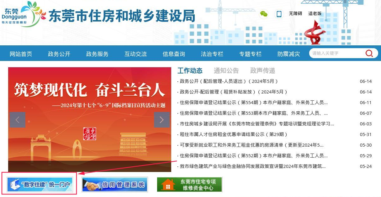 申购人可在2025年4月16日起登录网址:东莞市住房和城乡建设局https://zjj.dg.gov.cn/点击“数字住建”统一门户图标进入,如下图:
